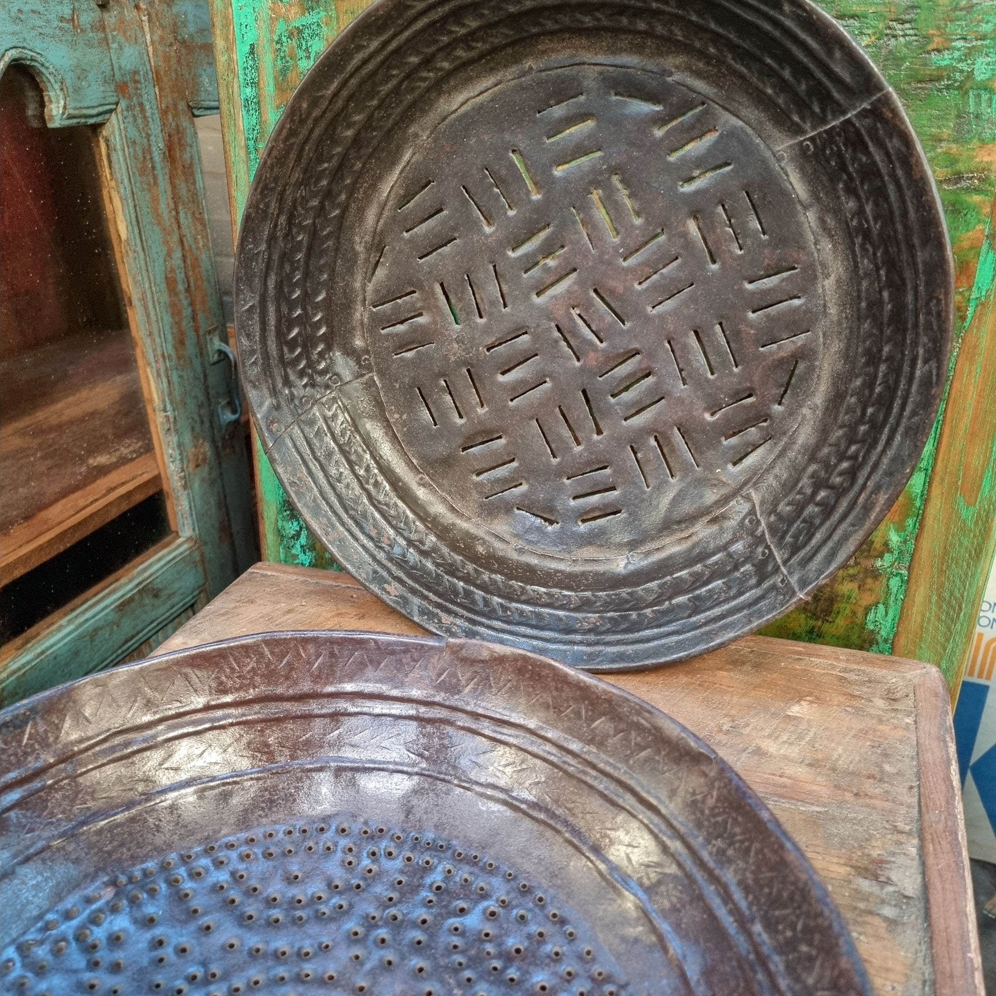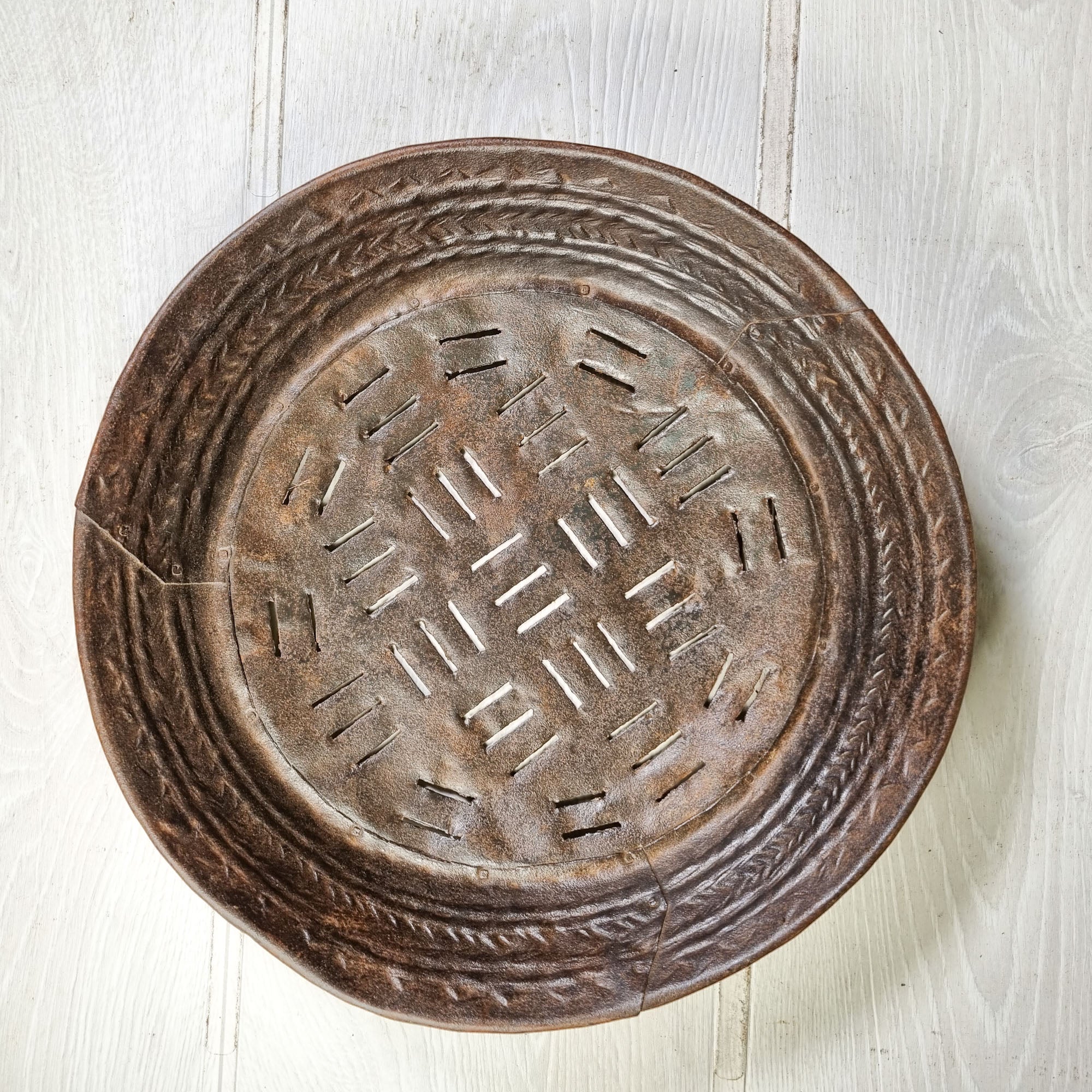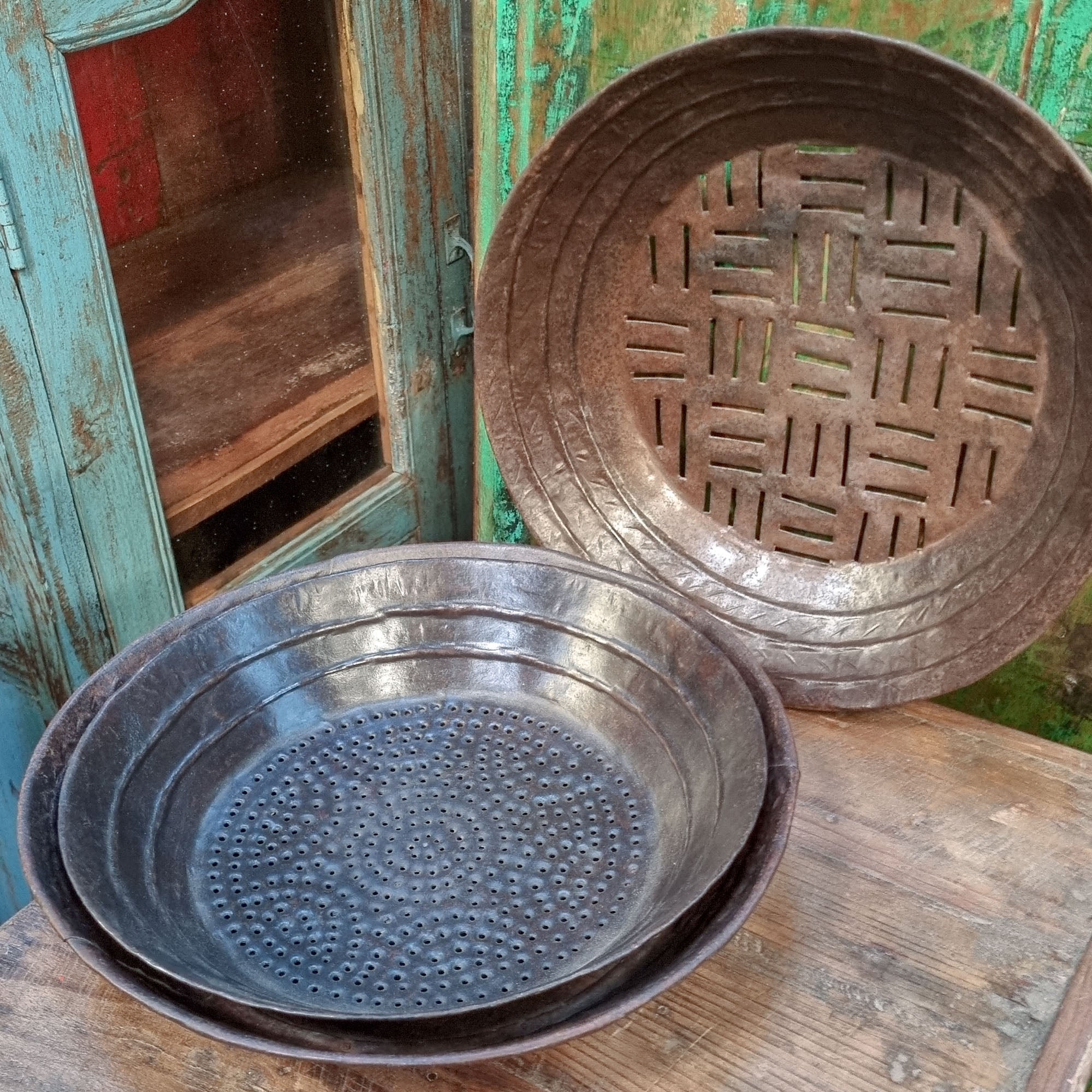 A lightweight hand-fabricated vintage sieve recently sourced from Rajasthan, North east India. Today they make decorative bowls for bread, fruit and other dried items. Each plate is carefully hand-beaten from iron sheets with a hammer and curved by very skilled traditional blacksmiths from the Lohar communities of Rajasthan. The result is work of art with a unique rippled curved surface and either holes or narrow slots. Traditionally used for separating whole grains and their husks.