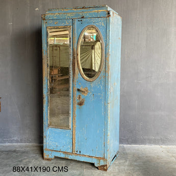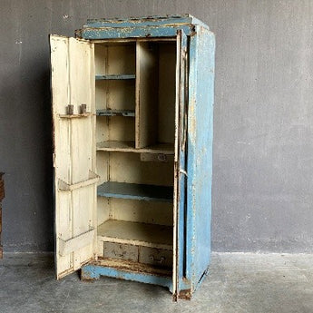 A fine example of a large metal vintage wardrobe from 1930s painted in a lovely vibrant Brahim-blue. This big volume wardrobe or cupboard has a raft of storage and display options giving you lots of practical and styling options.