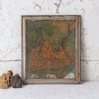 We love this old original Indian wall print depicting four women devotees listening to a religious teacher - Adi Shankaracharya and His Disciples. With a desirable faded patina, this historic Indian print illustrates traditional rural Rajasthani village life.