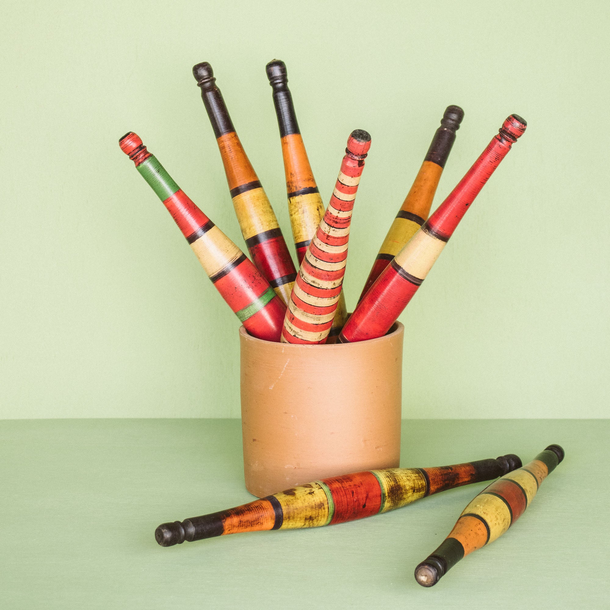A colourful rolling pin with stripes. Brightly coloured and iconic, these painted small rolling pins (also known as Veluns) are traditionally used for rolling and preparing chapattis, puris and parathas.