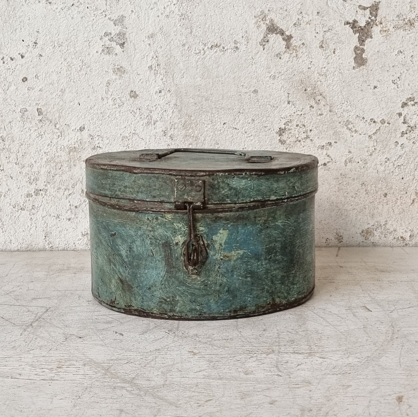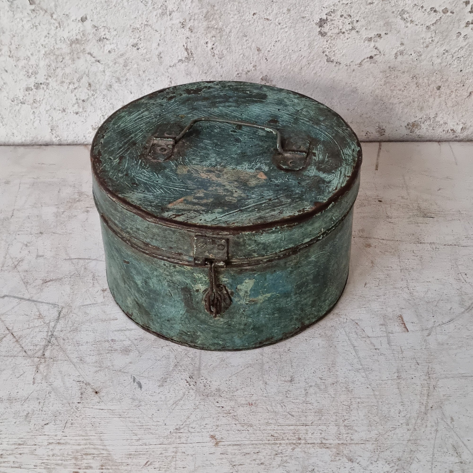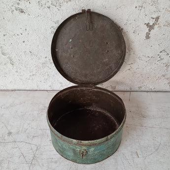 A large old blue tin that would have been used for storing grain in Indian households. It has a top handle and a hasp and staple for a padlock.