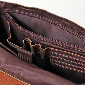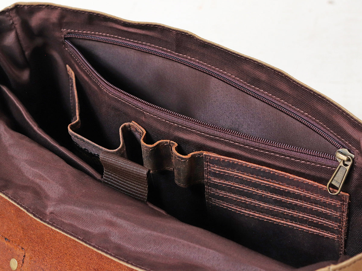 Our 15-inch messenger bags are made from distressed buffalo Hunter leather and due to the natural dyeing process, each bag has its own unique marks engrained into it. Our messenger bags have a stylish and sturdy construction with double stitching and tough grey canvas lining. The main compartment contains a zipped side pocket and there is an extra zipped pocket on the front, which makes organising your items, dare we say, fun. We’ve recently updated our bags with brass hardware that beautifully compliments the patina of our hunter leather. When we talk about modern functionality, we really mean it. We’ve added magnetic fasteners for an easy yet secure opening/closing, and the shoulder strap is 58”, giving you flexibility on the length you want to carry it.