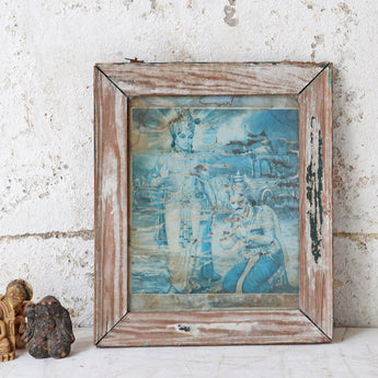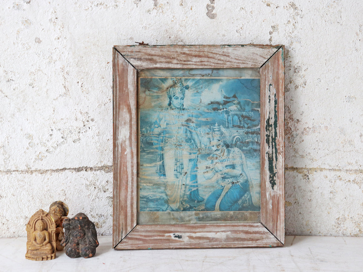 A wonderfully faded Indian wall print featuring Surya paying homage to Lakshmi - both important gods in the Hindu religion. This distinctive print and frame are decades old. The original frame has a lovely distressed surface – a perfect complement to this stunning image.