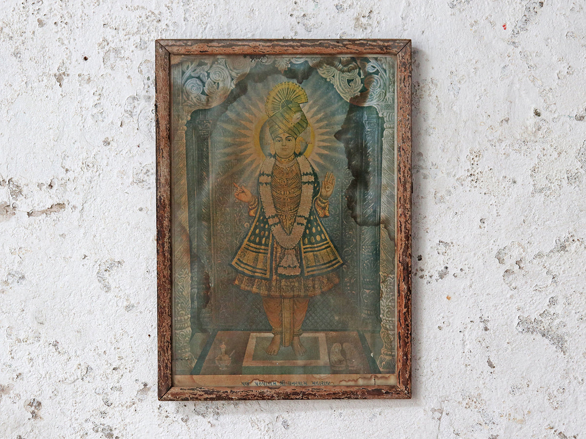 A wonderful old distressed Indian wall print depicting a regal-looking Rajasthani Maharaja. The illustration shows the style of jewellery and attire worn in that era in Northern India.