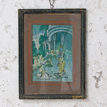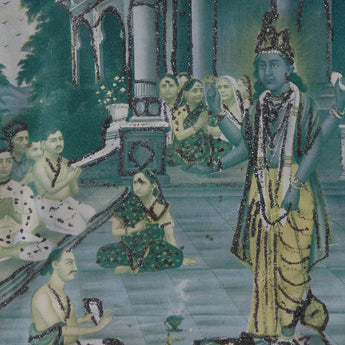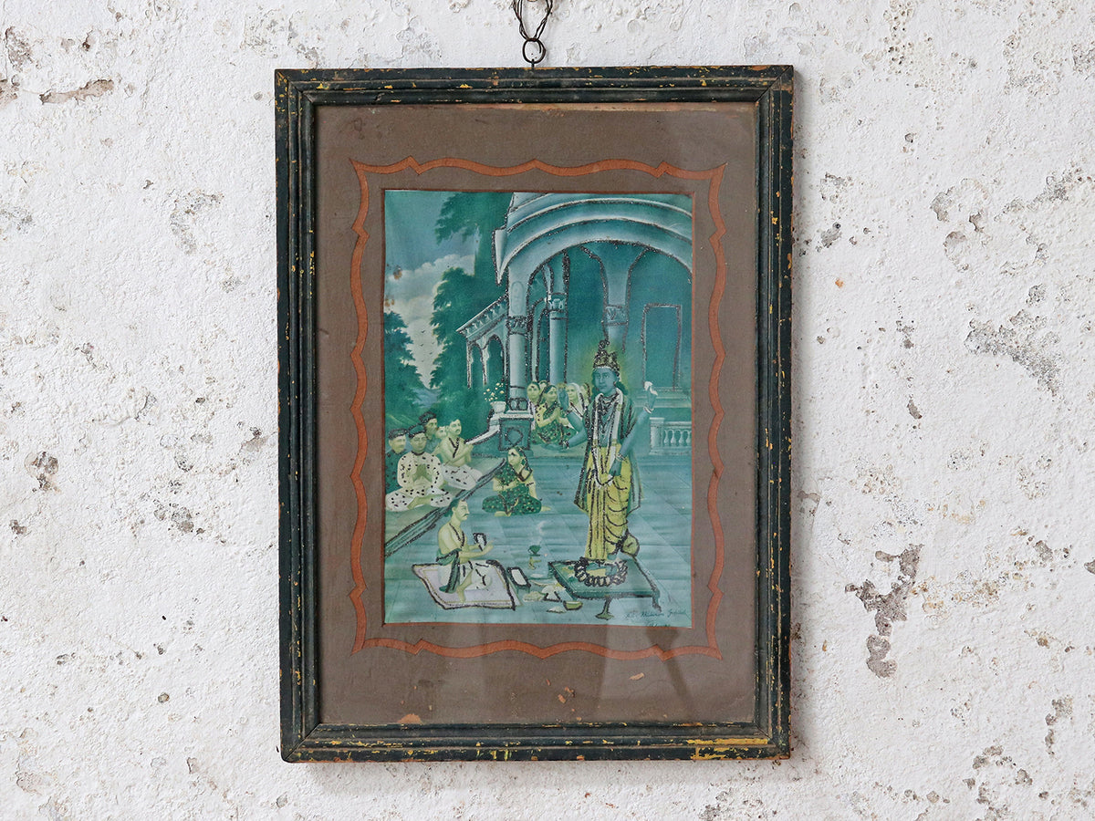 This lovely old Indian litho print sourced from Northern India depicts a Hindu scene of Satya Narayan. This distinctive print and frame are decades old. The original frame has a lovely slightly distressed surface – a perfect complement for this delightful image.