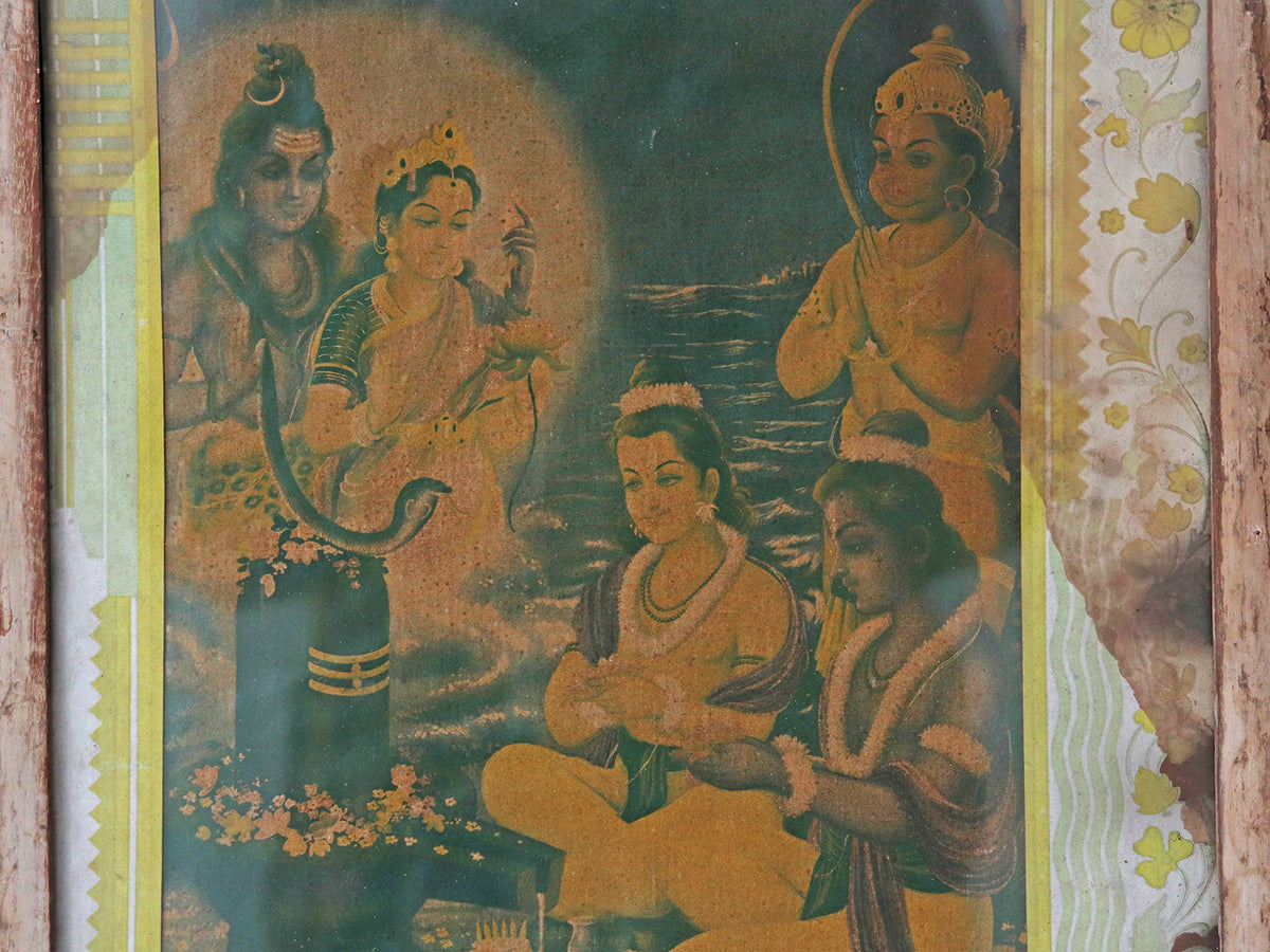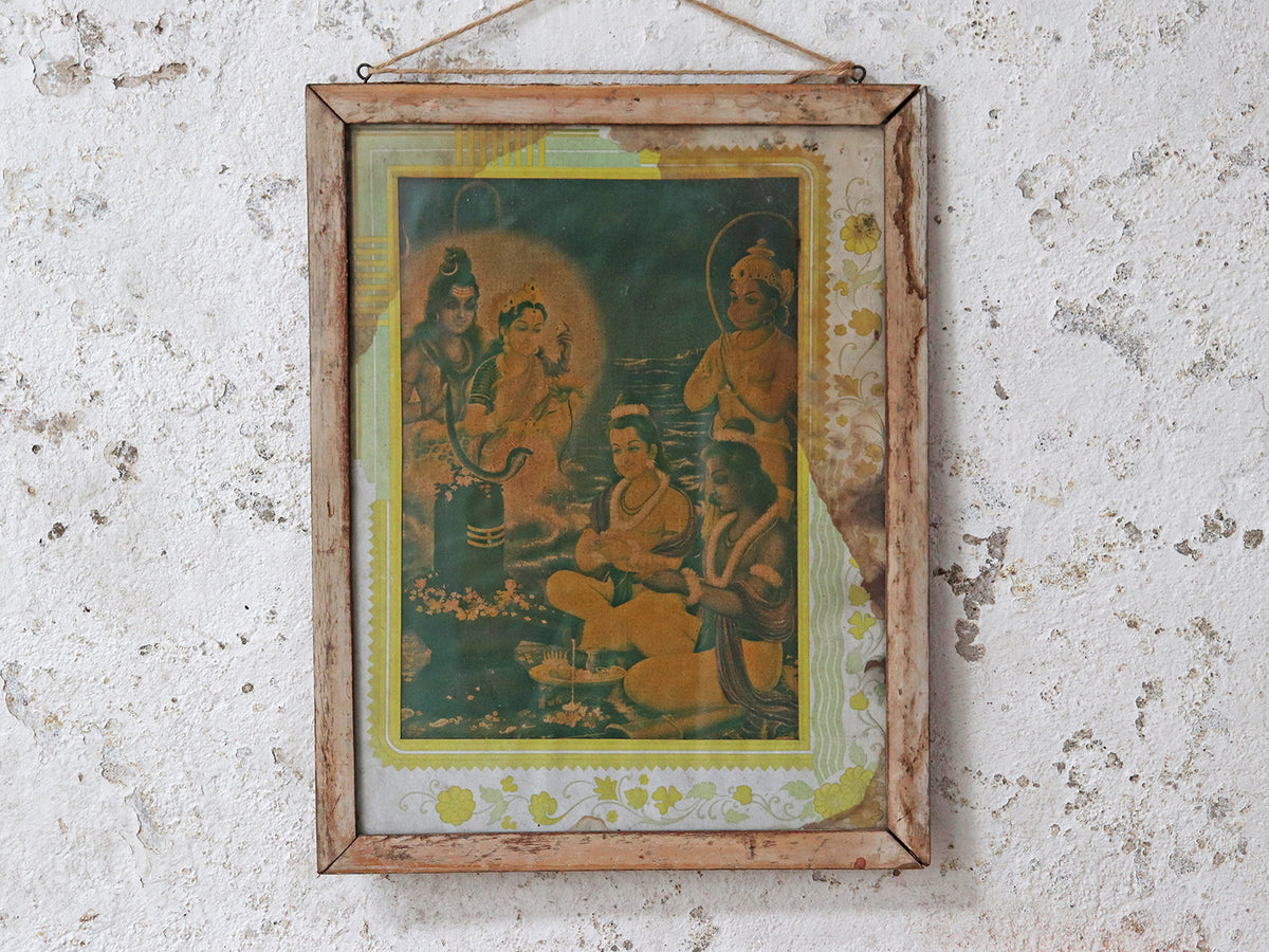 This old vintage Indian illustrative print represents a devotion scene from Hindu mythology.