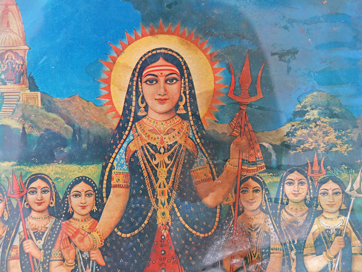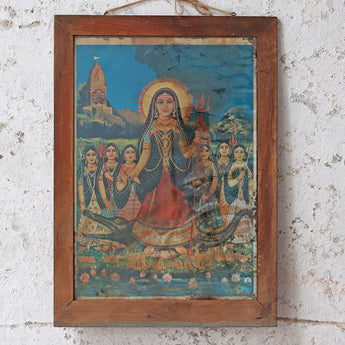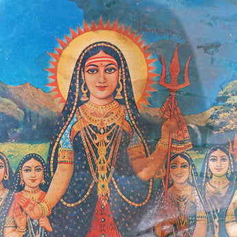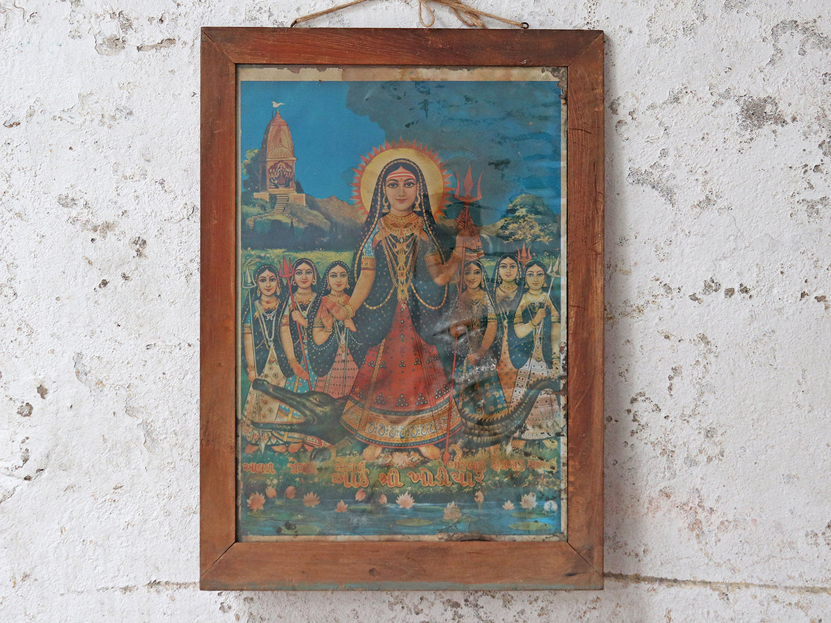 An engaging large vintage Indian wall art print of Khodiyar Mata - full of exotic colour and vibrancy. As a historical reference: The illustration is believed to be Mata. In the Hindu religion, Khodiyar Mata is the deity of the Patel community in Gujarat. She, like some other Hindu gods, is depicted as riding on a crocodile in religious literature.