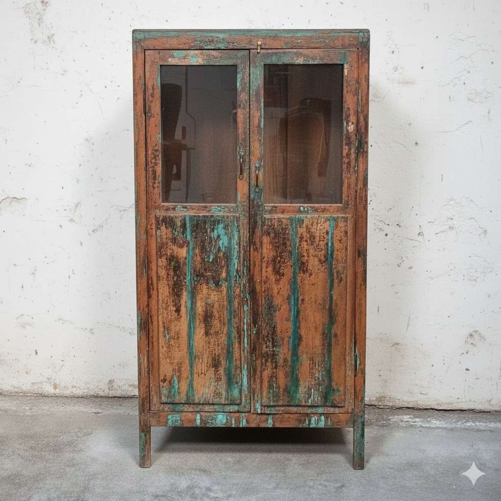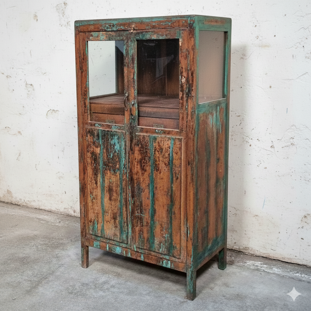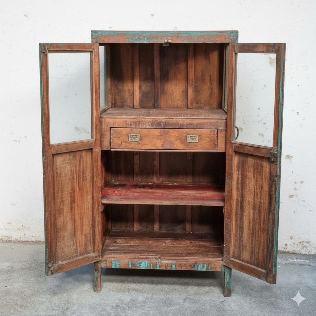 This large vintage cabinet could be used as a wardrobe or even a kitchen cupboard in a free standing kitchen. It has so many uses. It still retains its distressed paintwork, which reveals the original golden teak. The upper door and side panels are glazed. The doors open to reveal a shelved lower section, a middle-level drawer and an open upper compartment.