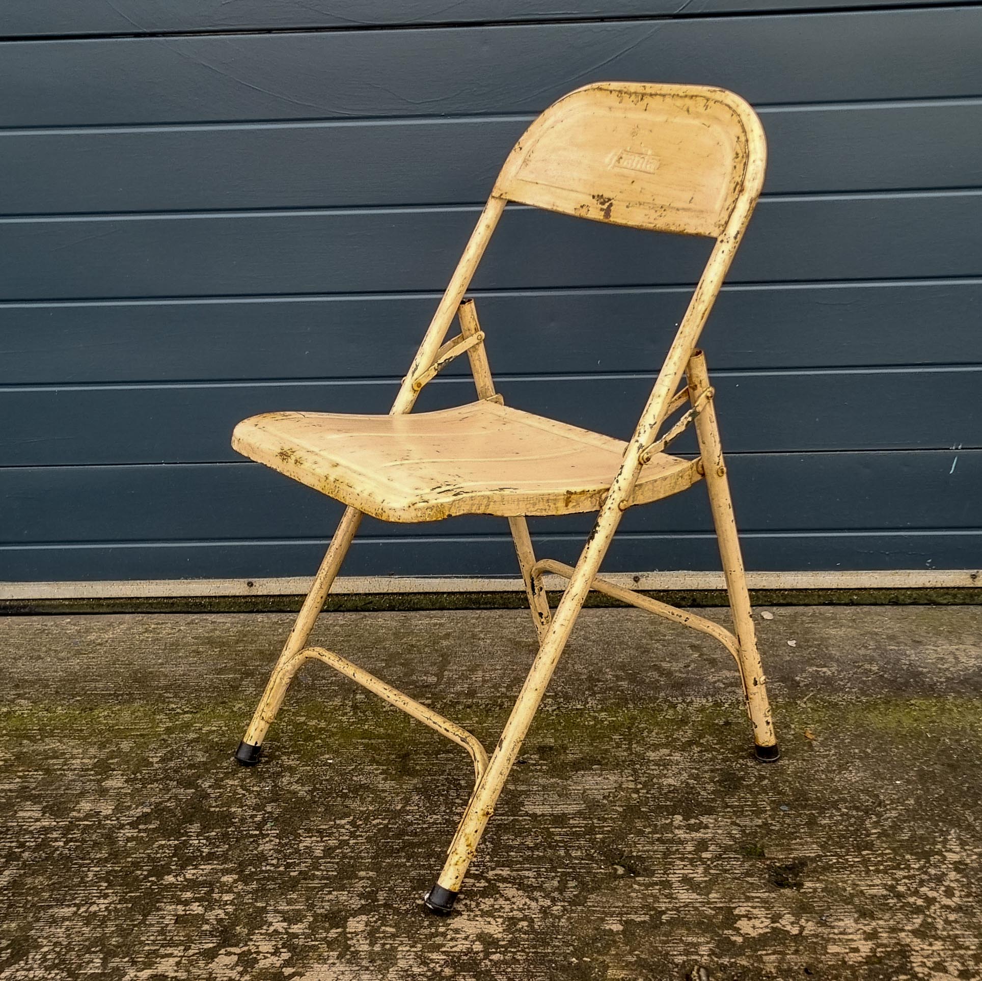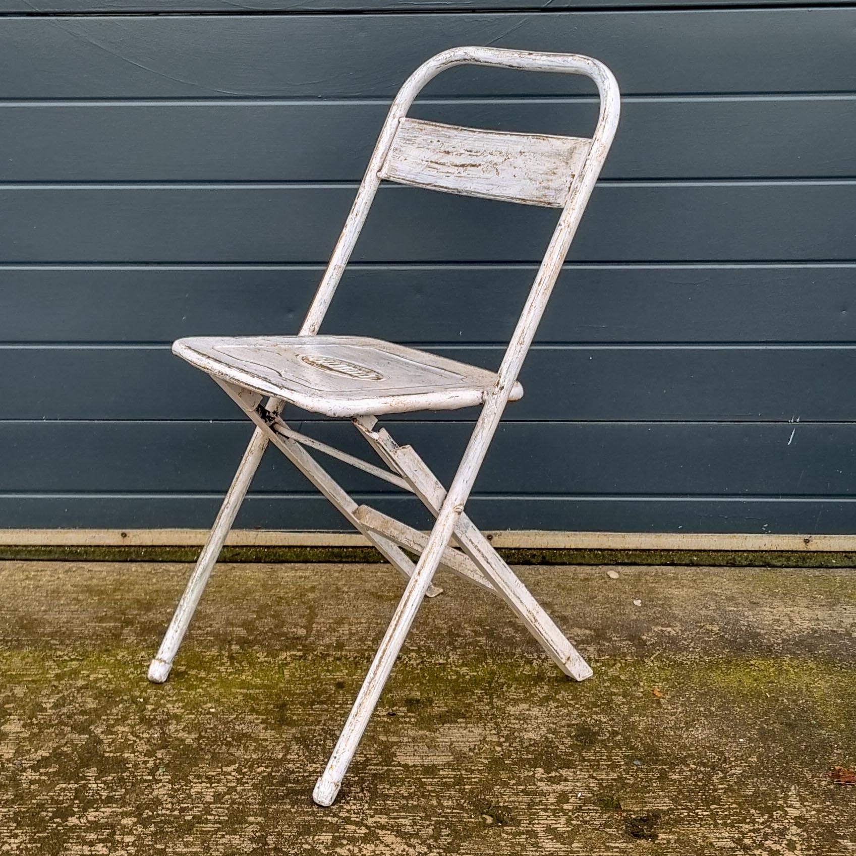 These vintage folding chairs are not new or made to look old. They will have areas of historic paint repairs, missing paint, marks and scratches on them, which are consistent with their age and original use. We feel these add to their character and appeal.