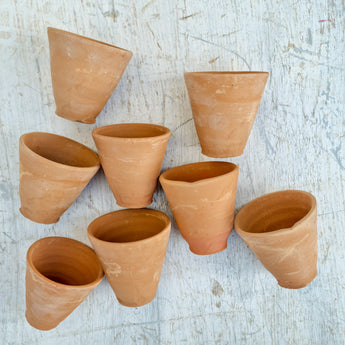 These hand-spun mini-wonders are hand-made in natural unglazed terracotta clay and then kiln-fired. So expect to see irregular edges, finger marks and a variation in the colour/tone due to the ash and variation in mineral content.