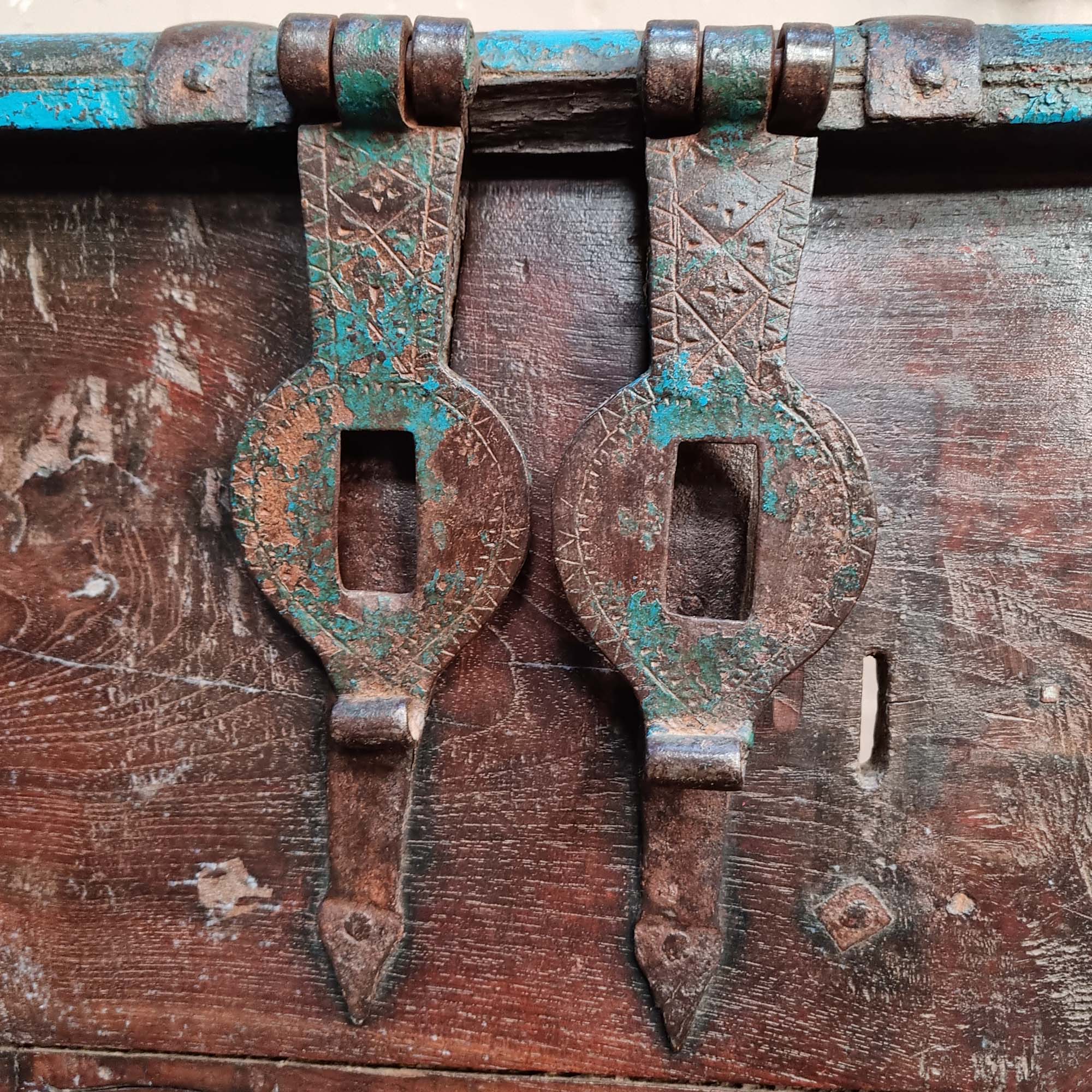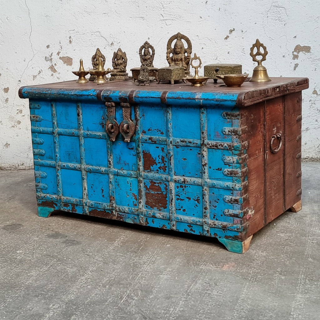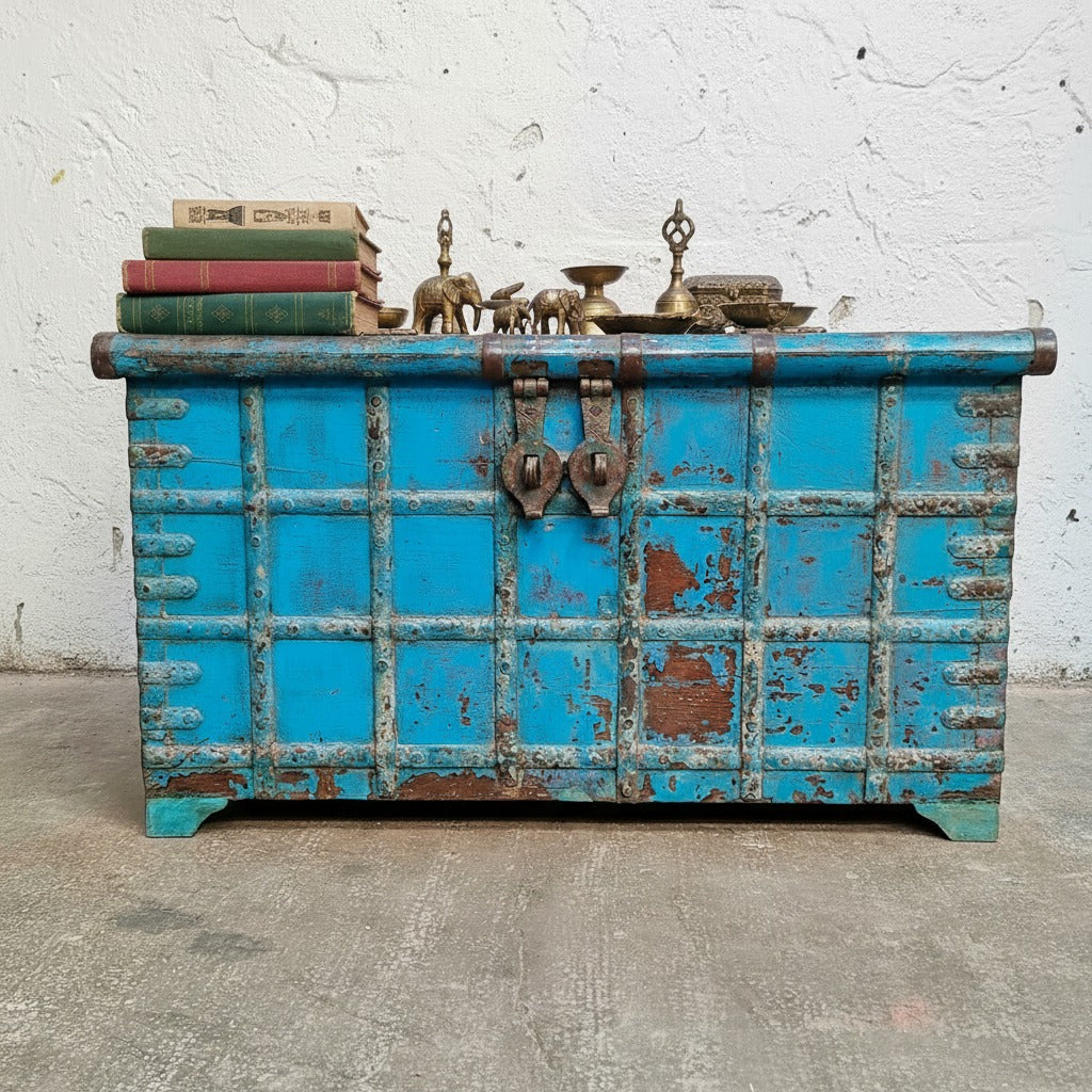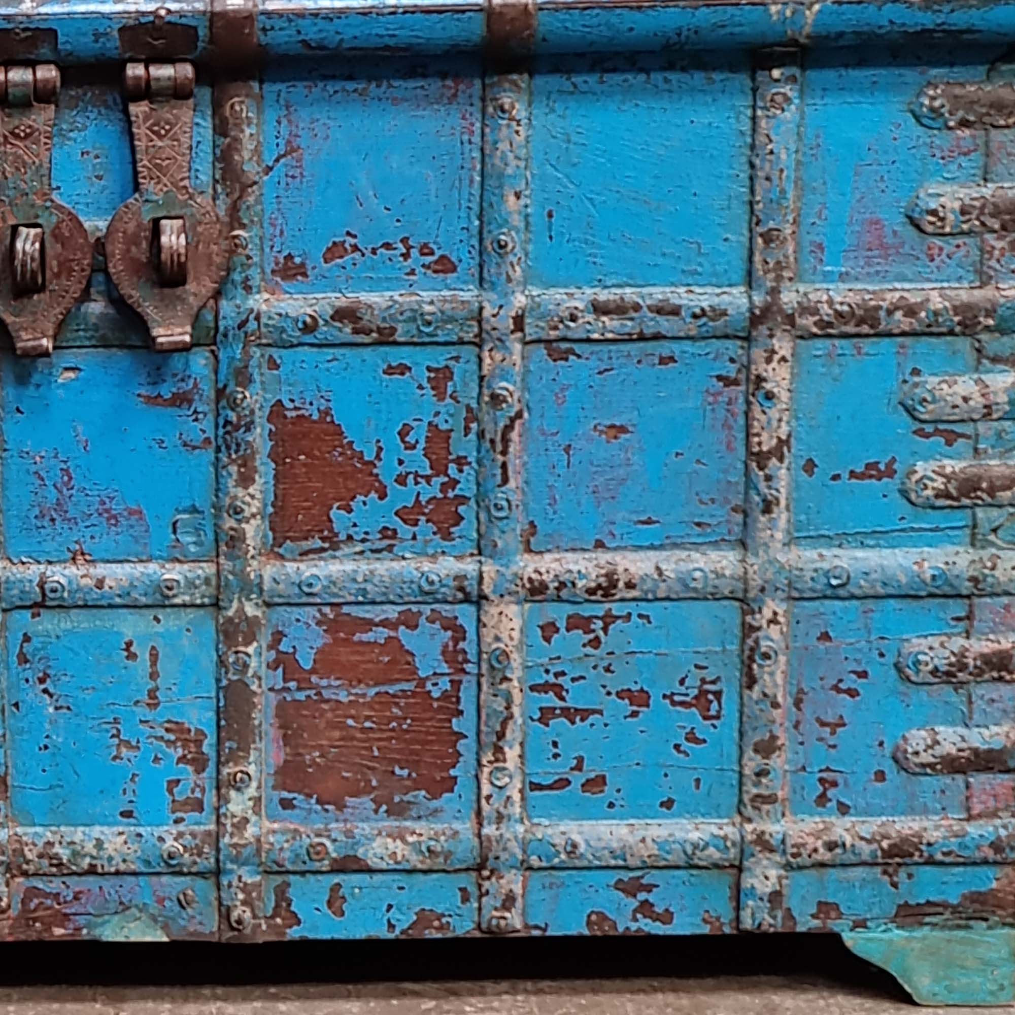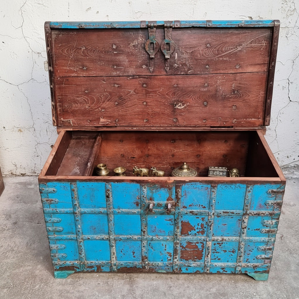 A magnificent grand pitari treasure chest from Rajasthan, NW India. This impressive chest would have been used for storage in a large house. Perhaps a successful trader. We have kept its original faded blue paintwork. This charming teak hardwood chest has a great surface patina that has evolved over decades of lovingly waxed polishes - its scuffs and scratches add a wonderful charm and authenticity. We estimate the chest to be 130-150 years old.