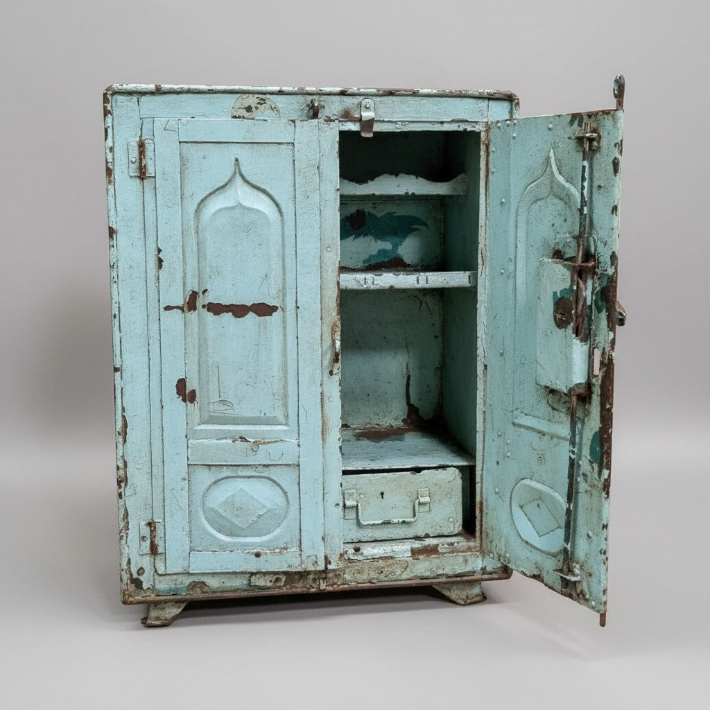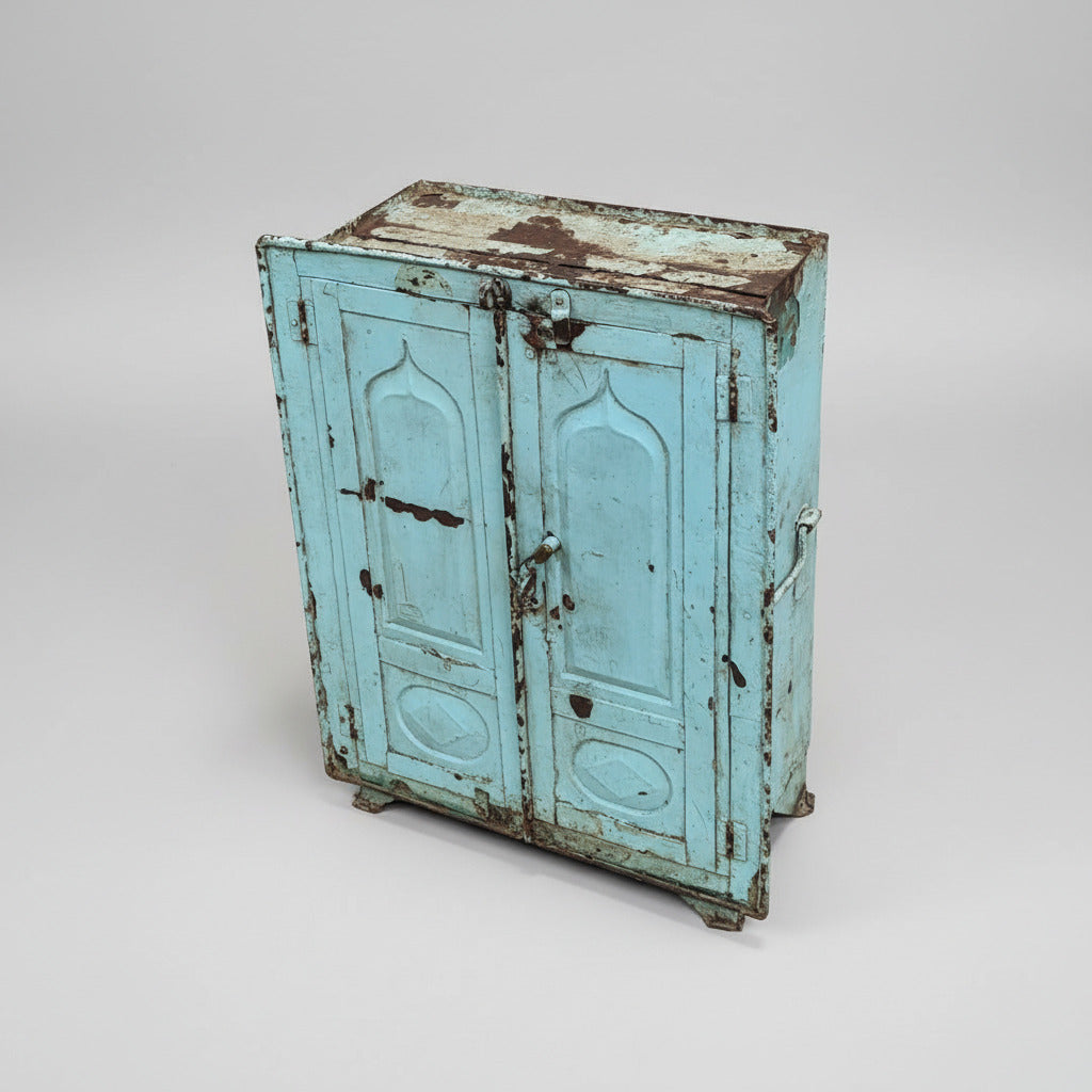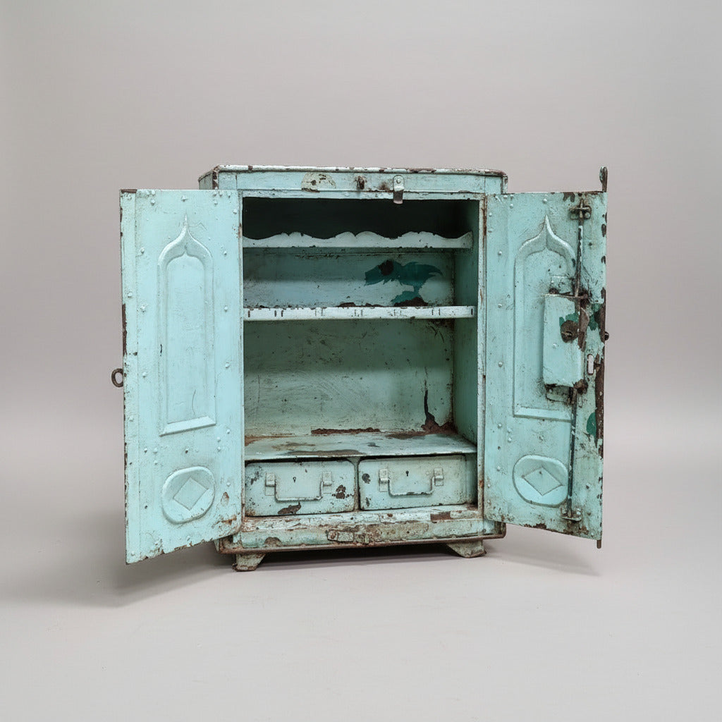 A wonderful example of a vintage metal cabinet with some great styling detailing. This cabinet would have been used in a traditional Rajasthani or Gujarati shop of office and would have been used to store valuable merchandise like jewellery or important documents. It has a locking sliding bolt that can be secured with an antique brass or iron padlock. Why not add some industrial chic to your home study...or home workshop with this unique piece?
