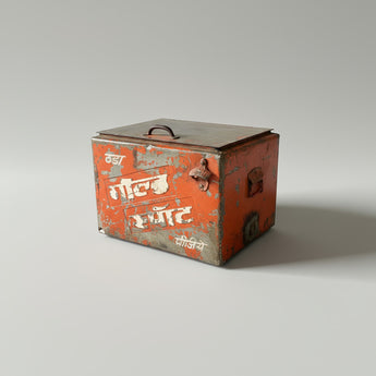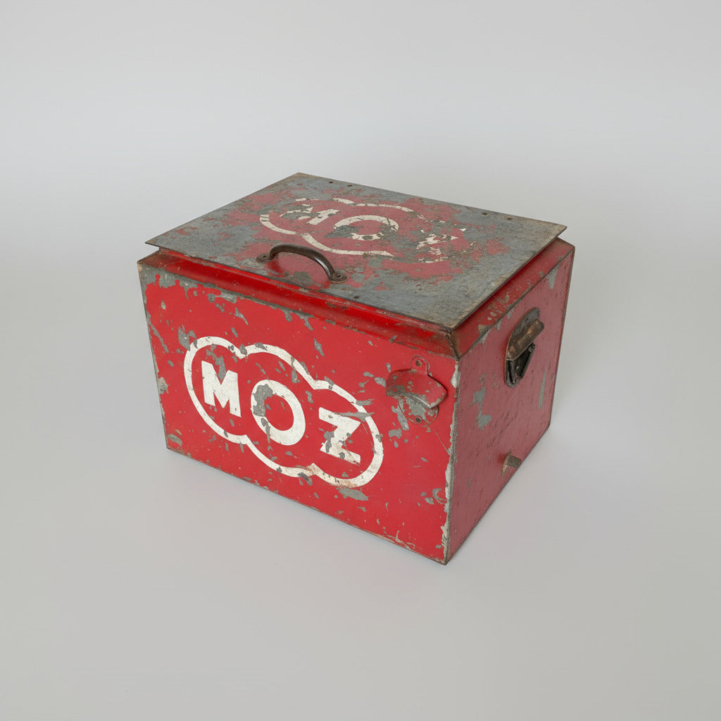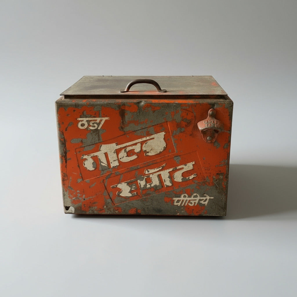 Authentic vintage Gold Spot coolbox from the 1970s and 80s. These boxes have their original time-worn red painted finish. This original vintage soda coolbox would make a great iconic feature in your living room, bedroom or kitchen. Gold Spot was an Indian sparkling orange drink brand that was very popular at the end of the 20th century before it was acquired by Coca Cola and discontinued to be replaced by Fanta orange.