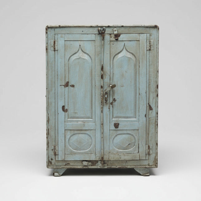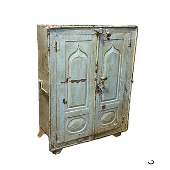 A wonderful example of a vintage metal cabinet with some great styling detailing. This cabinet would have been used in a traditional Rajasthani or Gujarati shop of office and would have been used to store valuable merchandise like jewellery or important documents. It has a locking sliding bolt that can be secured with an antique brass or iron padlock. Why not add some industrial chic to your home study...or home workshop with this unique piece?