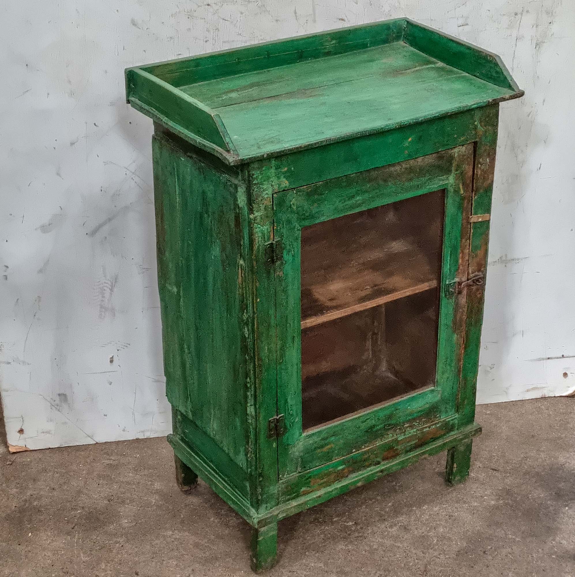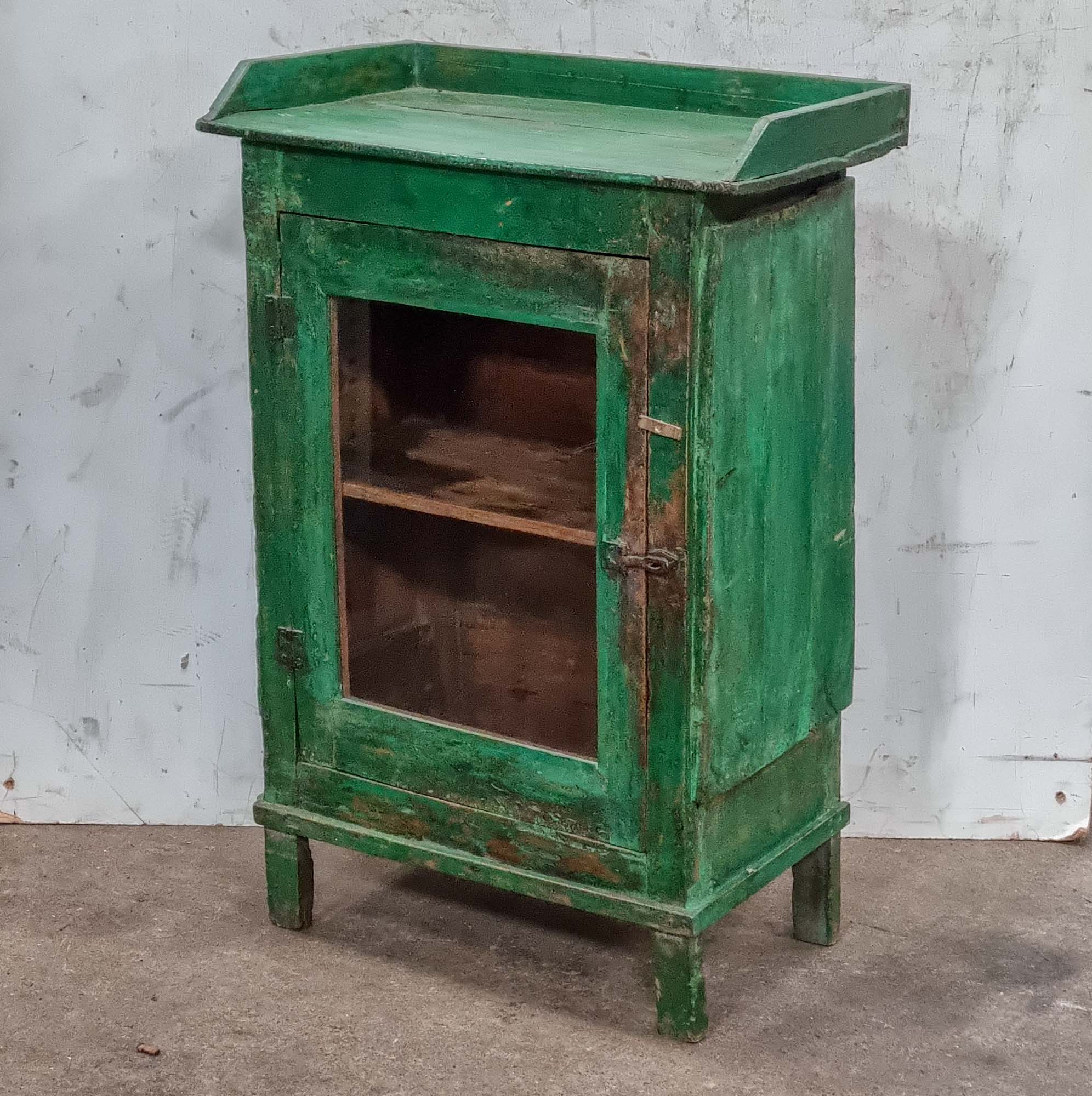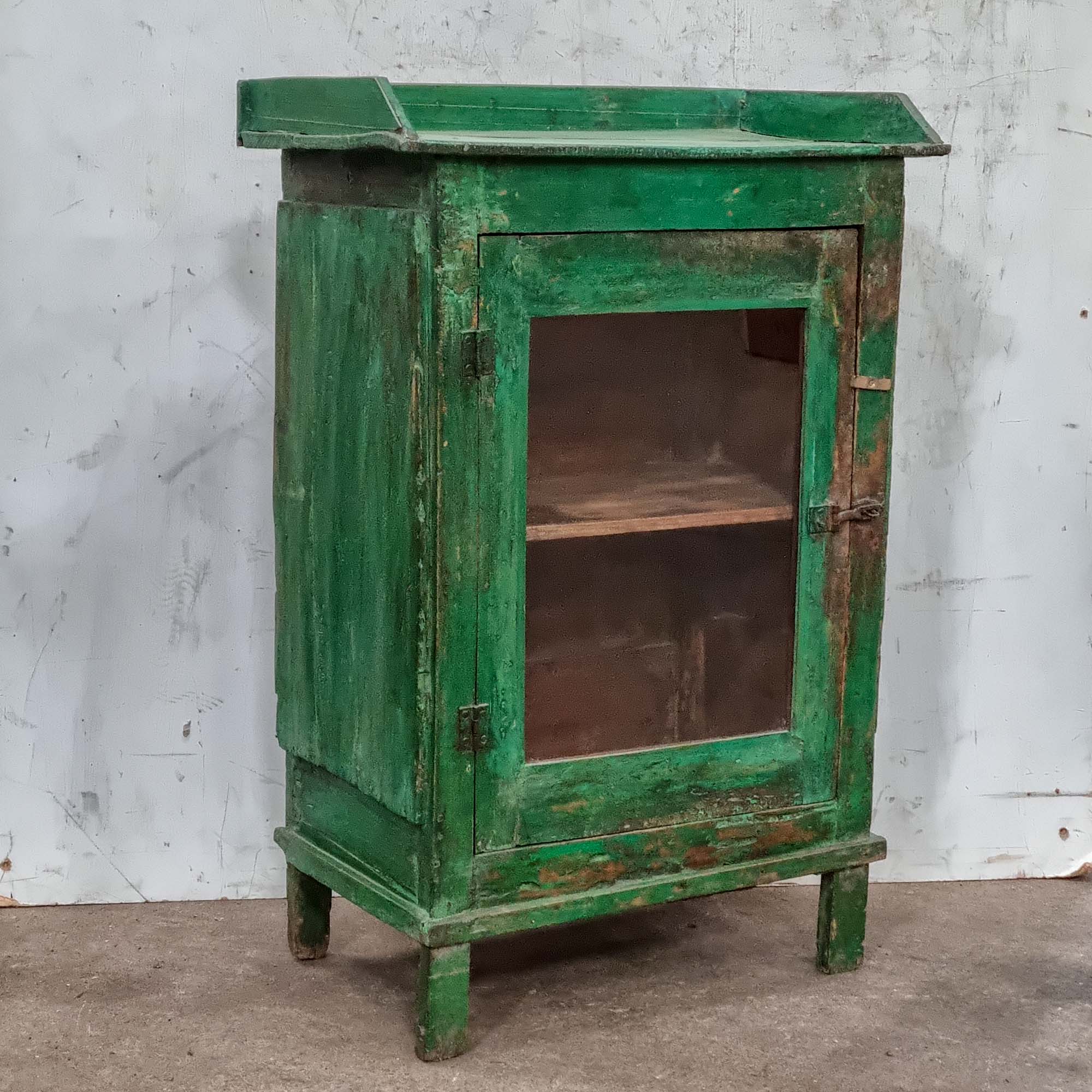 A compact green vintage cabinet with an anthentic rustic look and feel. It has a wonderful distressed shabby chic surface finish. It's an old hardwood item, which - in true Scaramanga form - would offer a raft of new storage space for a stylish home.