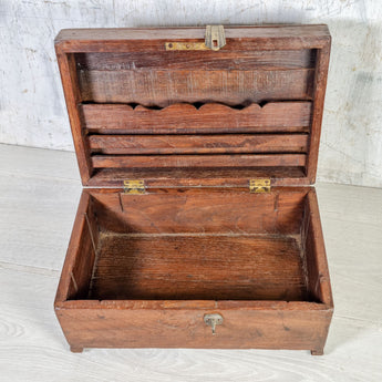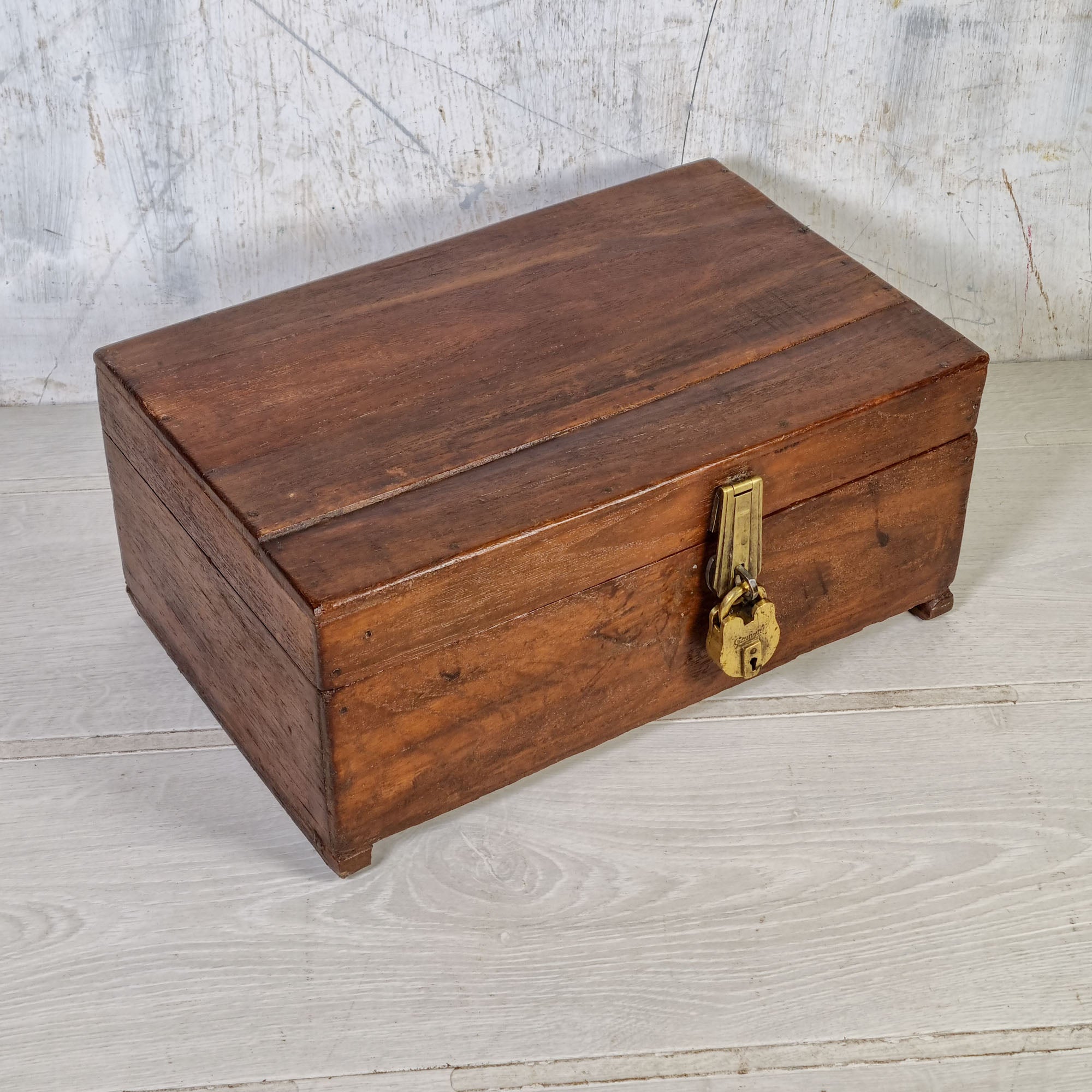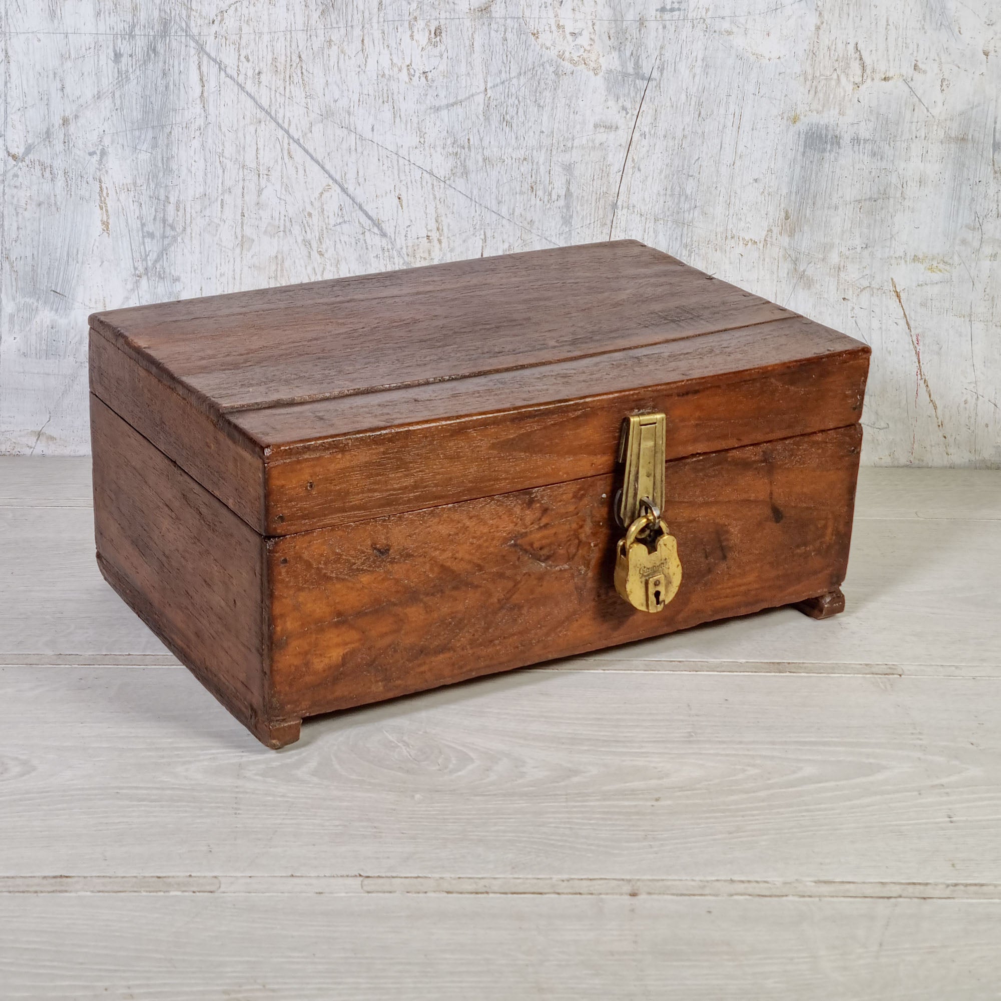 This is a wooden antique chest that a merchant used to store their money, receipts, and records at one of India's bustling traditional city markets. Today, it could be used as a memory box or jewellery box. Made from solid golden teak, it features multiple upper-level compartments and a secret compartment accessed through a sliding lid.