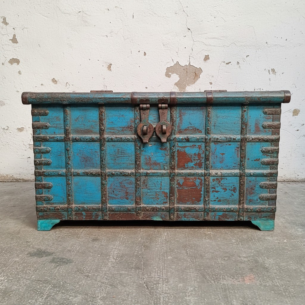 A magnificent grand pitari treasure chest from Rajasthan, NW India. This impressive chest would have been used for storage in a large house. Perhaps a successful trader. We have kept its original faded blue paintwork. This charming teak hardwood chest has a great surface patina that has evolved over decades of lovingly waxed polishes - its scuffs and scratches add a wonderful charm and authenticity. We estimate the chest to be 130-150 years old.