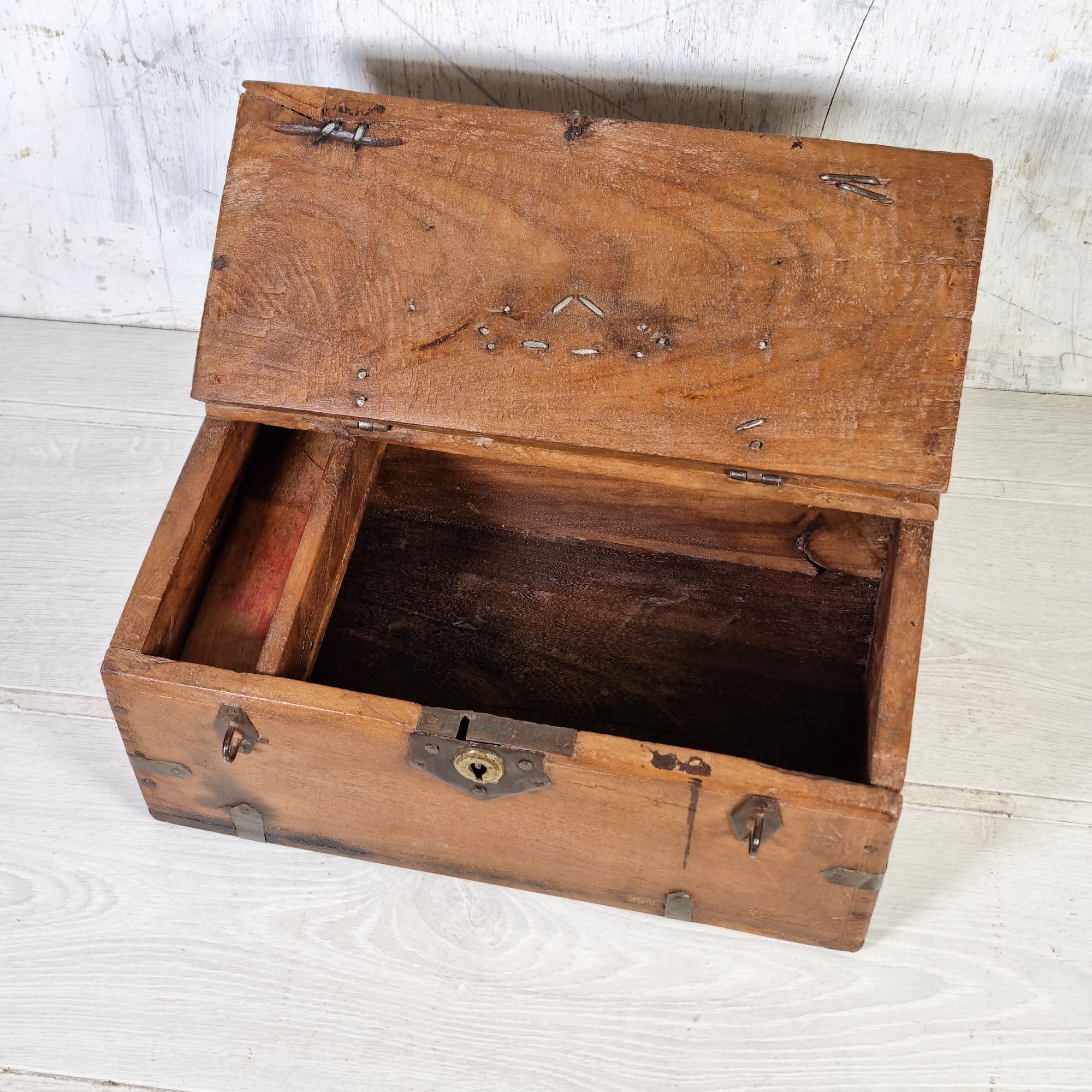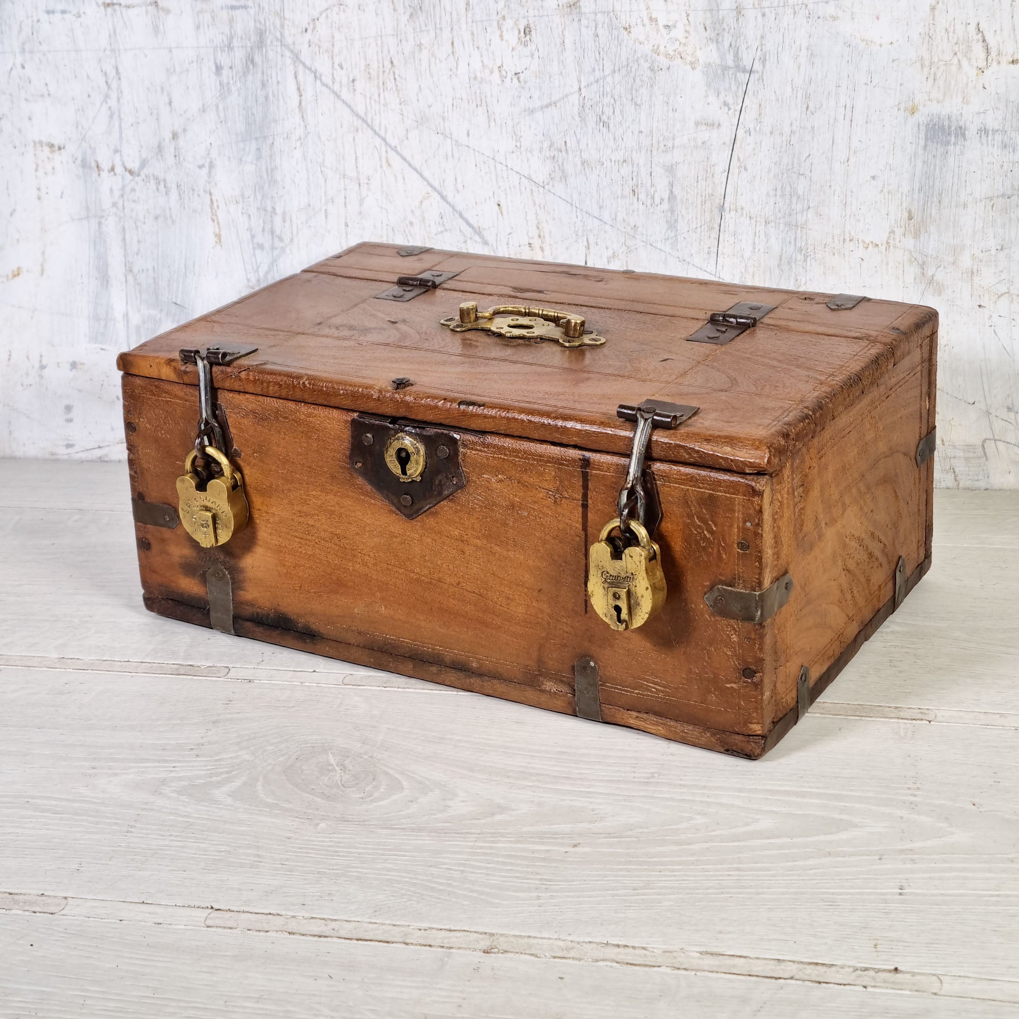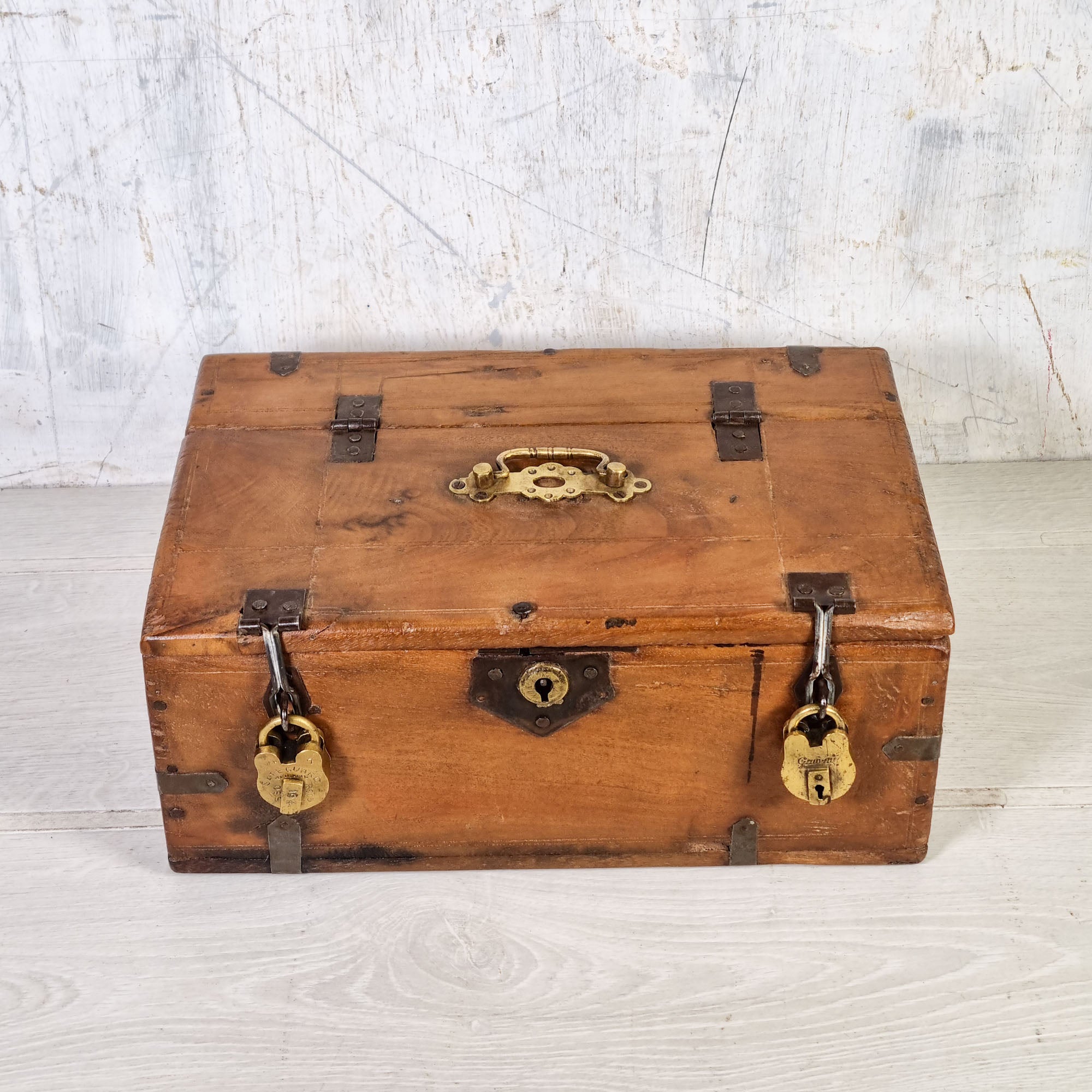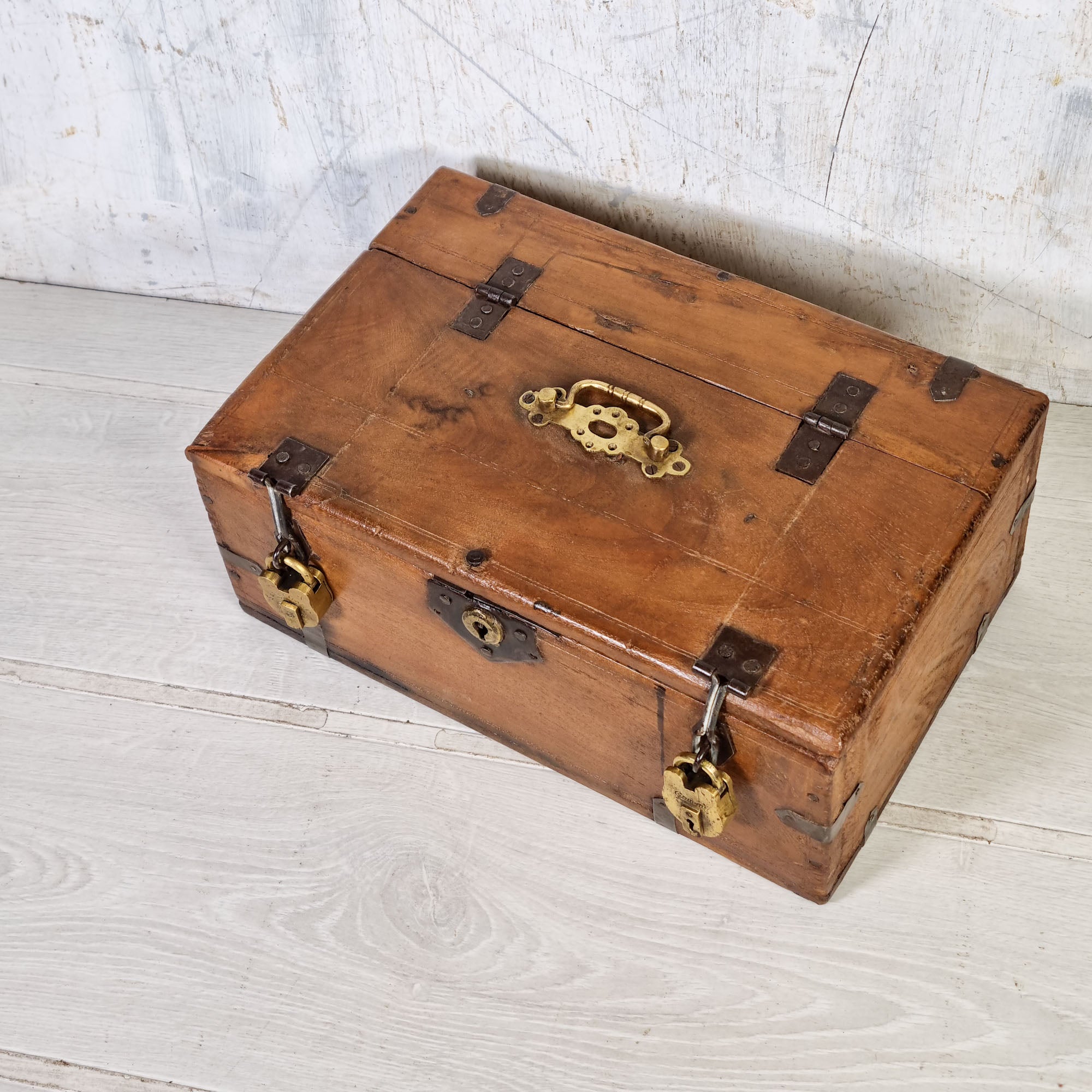This one is made from solid golden teak and has a decorative brass handle and 2 hasps and staples.