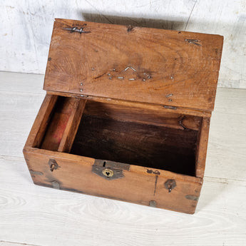 An original vintage wooden Indian merchant's cash box. Typically used to secure money, nites and receipts these boxes were once common across the bustling traditional markets of India. Today they make striking memory boxes or jewellery boxes.