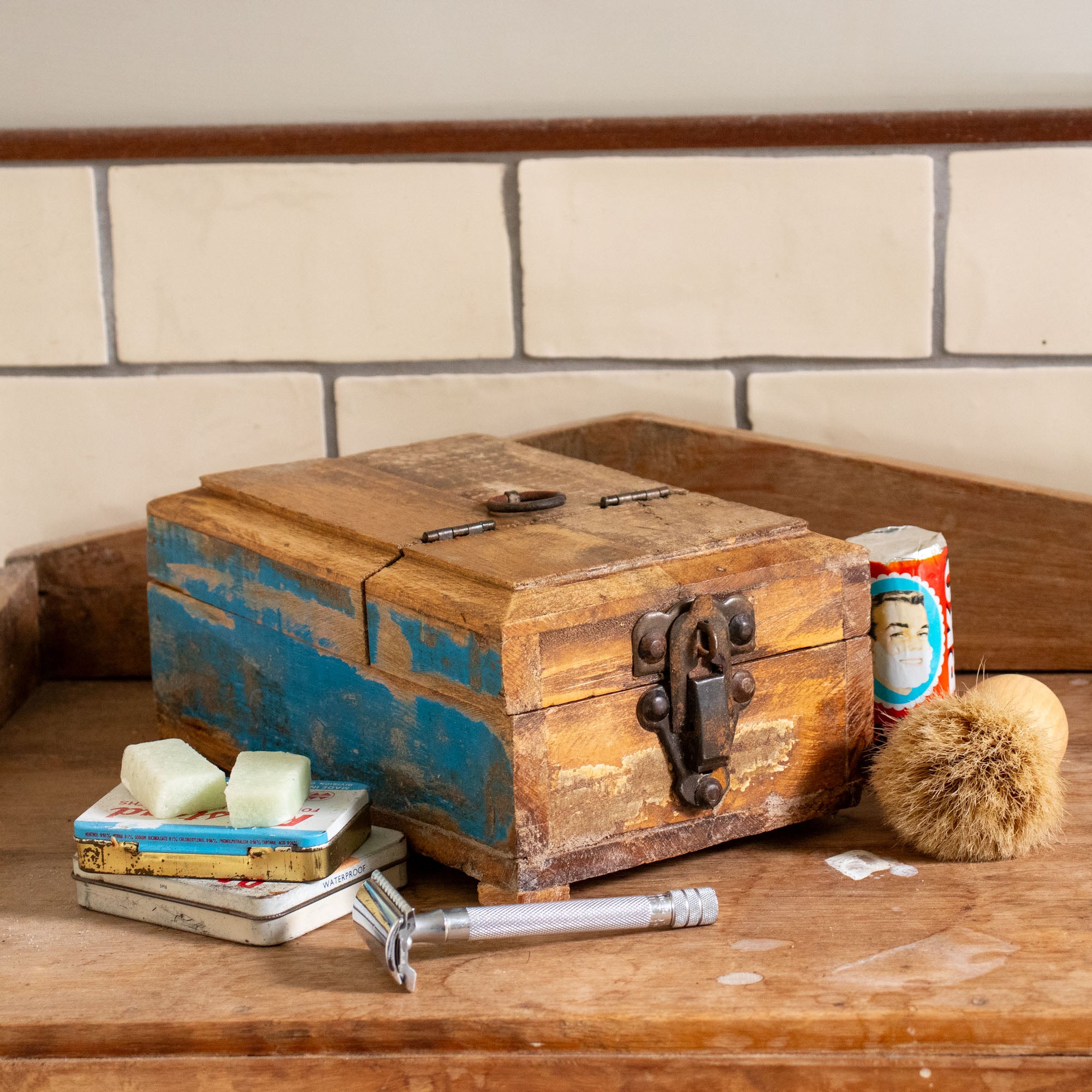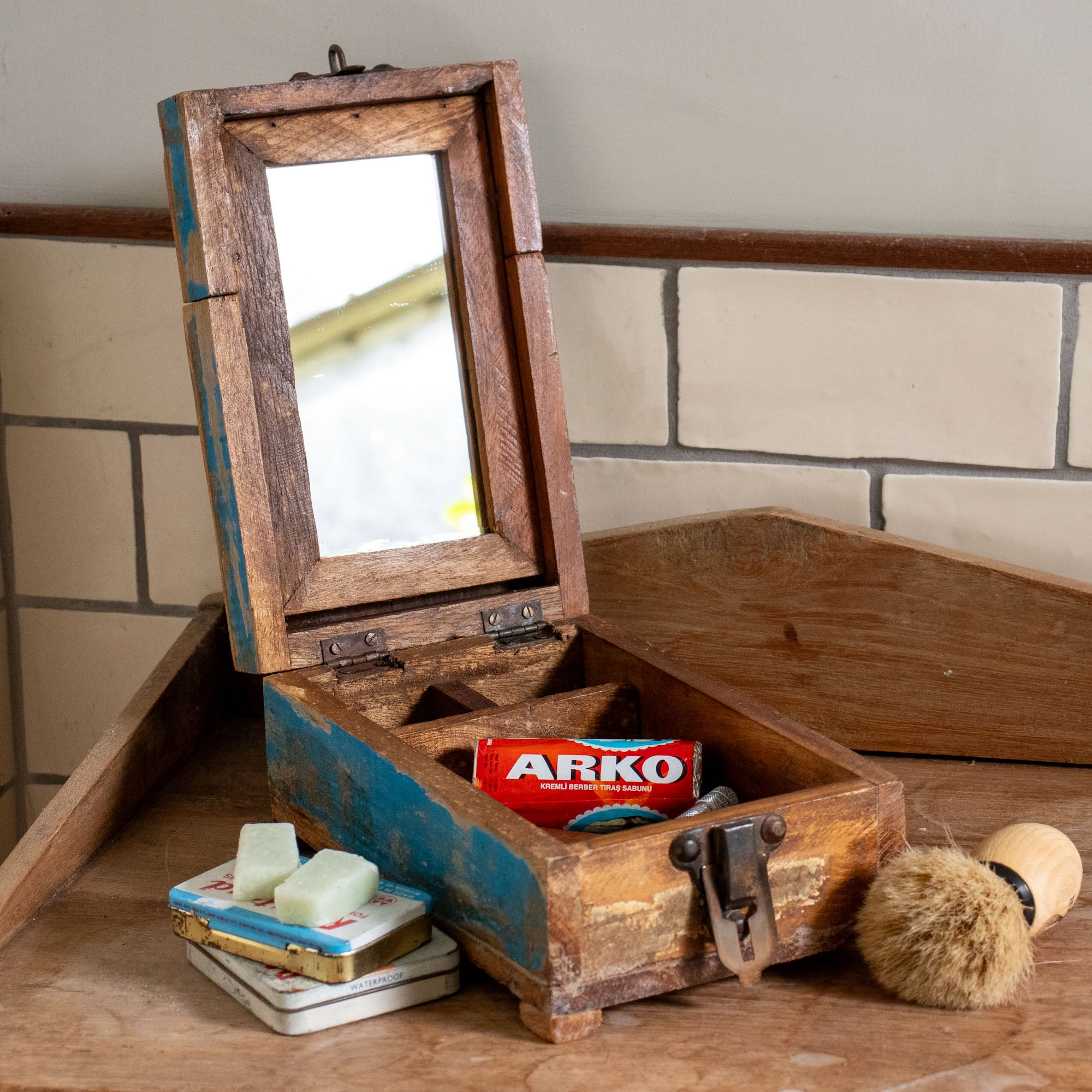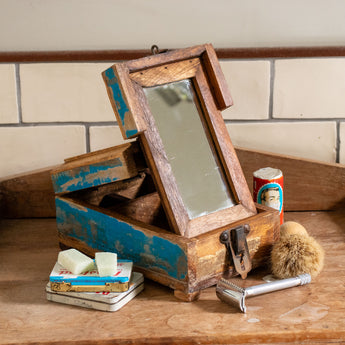 A wonderful solid teak vintage-style shaving box that folds out. A skilled carpenter has handmade each box using traditional tools and skills. The box reveals a mirror, two small upper compartments and a larger main compartment.