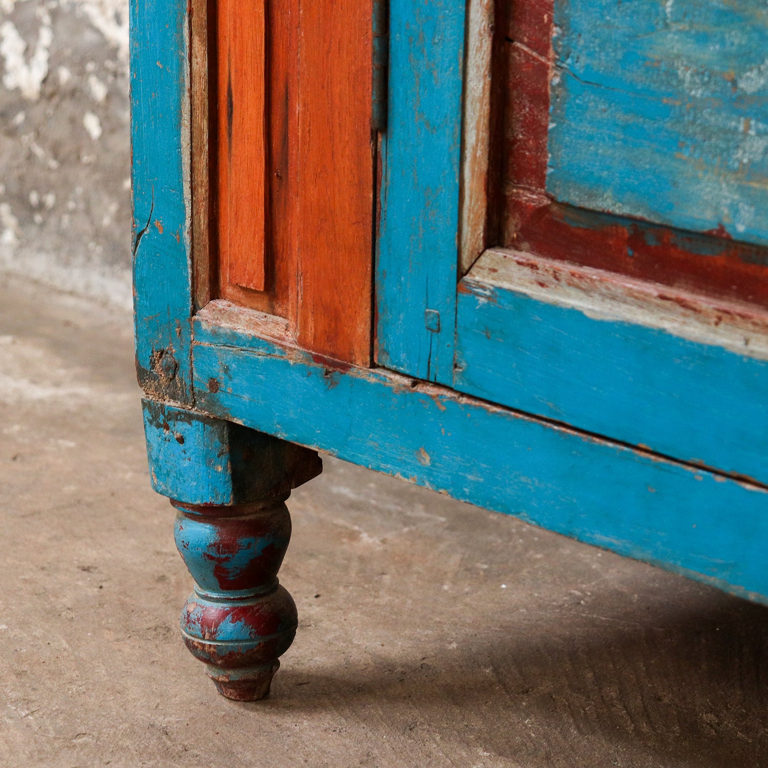 Over the years, its original blue paint has been eroded to reveal the wood below. It takes decades to create an authentic shabby chic texture like this. With every new waxed polish the appeal and charm of this old sideboard cabinet will increase. The cabinet will only get better and better!