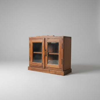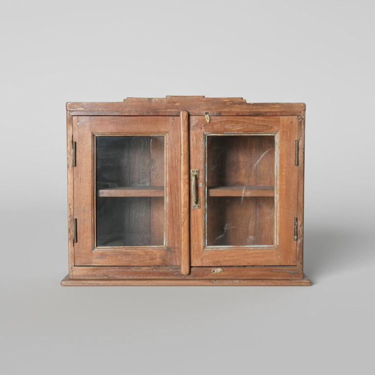 This vintage double door display wall display cabinet is handcrafted from solid golden teak hardwood. It would work in a kitchen, bathroom or living room. If you like to display your bits and pieces, then this easy-to-hang cabinet could be for you. We love the simple distinctive geometric Art Deco crown - all authentic references to its pre-loved past life.